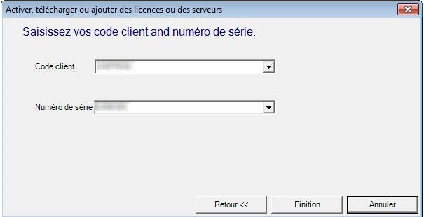 Si vous avez choisi la première option, renseigner votre code client et vos numéros de série. Pour un renouvellement de licence, votre code client et vos numéros sont déjà mémorisés. Utiliser le menu déroulant pour choisir la bonne licence et valider en cliquant sur « Finition ».