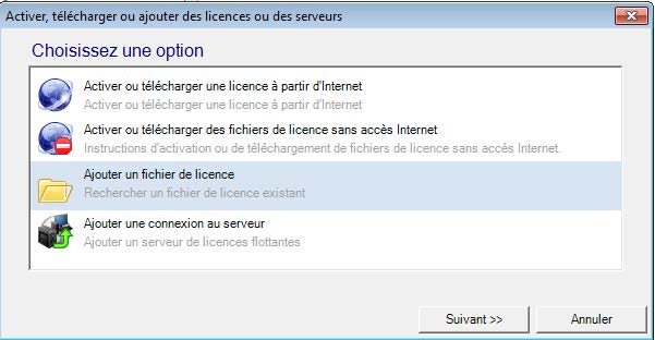 Choisir l’option « Activer ou télécharger une licence à partir d’internet » si vous disposez d’une connexion internet ou l’option « Ajouter un fichier de licence » si vous disposez du ou des fichiers .lic.